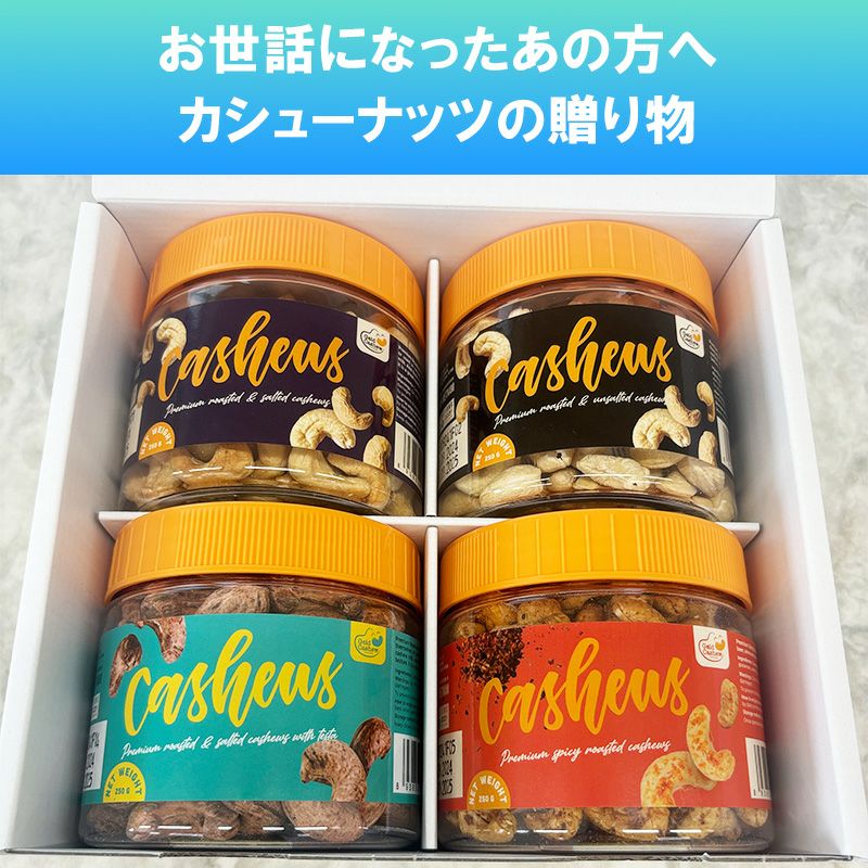 ゴールドカシュー・プレミアムローストシリーズを4個詰め合わせたギフトセットです。 お歳暮やお中元などの贈り物にもピッタリです。